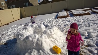 We built a snow castle this time. The girls were good helpers and helped me to pack the bucket full of snow for their castle.
